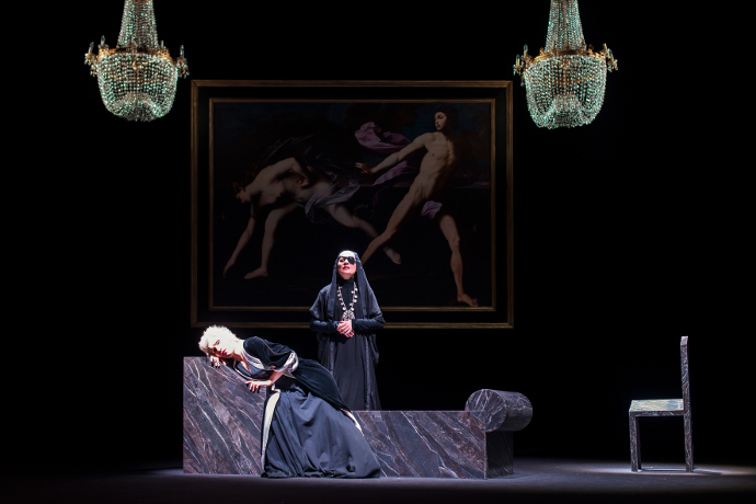 Quando si apre il sipario, al Teatro Bonci, si rivela invece uno spazio di astratta cupezza, dominato sul fondo da una grande riproduzione dell’Atalanta e Ippomene di Guido Reni, quella che sta a Capodimonte, con i suoi colori notturni e quell’idea di sospensione del tragico che trasmette. Amore che chiama morte. Un involucro nero che due grandi lampadari non riescono a illuminare, dilatato dalle quinte specchianti che raddoppiano i busti neoclassici posti ai lati, unici richiami a un ormai lontanissimo mondo classico. Fedra ora è distesa su una sorta di dormeuse marmorea. Accanto a lei la luttuosa Enone di Bruna Rossi che a dispetto della postura monacale, o forse proprio per questa, è un po’ l’anima nera della tragedia, colei che fa precipitare la vicenda verso l’esito tragico. E alla fine si uccide un poco incredula anche lei della colpa che Jean Racine le butta addosso nella tragedia, qui proposta nella traduzione di Giovanni Raboni. Perché mica si può esagerare nell’incolpare una principessa, scrive a premessa Racine. Questa bassezza gli sembra convenire di più a una serva. Fedra le confessa allora la passione incestuosa per Ippolito, il figlio dello sposo Teseo, che invece sembra odiarla.